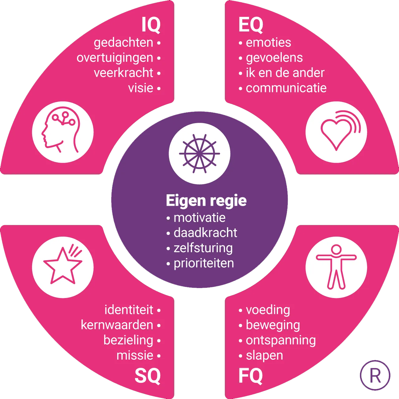 We hebben dagelijks onze gedachten (IQ) en bijbehorende emoties en gevoelens (EQ) die ervoor zorgen wat we lichamelijk (FQ) ervaren. Dit resulteert in gedrag; het ondernemen van acties met bijbehorende verantwoordelijkheden (Eigen regie). Dit alles doen we vanuit wie we zijn, waar we voor staan en wat we belangrijk vinden (SQ). De ene dimensie staat niet los van de andere, ook al heeft een dimensie meer aandacht nodig.